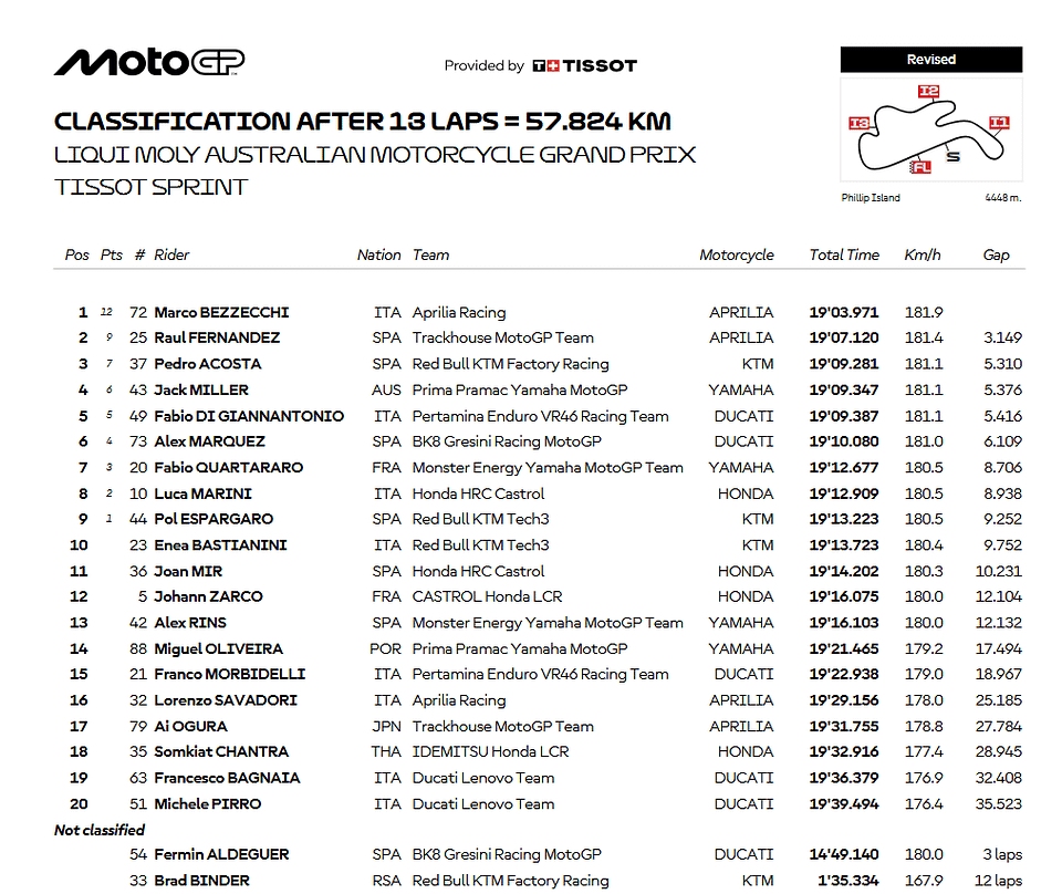 Embed from Getty ImagesBezzecchi fez jus ao seu título de favorito antes da Sprint e conseguiu o resultado pelo segundo sábado consecutivo, enquanto Fernandez também conquistou dois pódios consecutivos na Sprint, tornando-se a primeira dobradinha da Aprilia numa Sprint Tissot. Acosta resistiu à pressão final de Miller e Di Giannantonio e manteve o terceiro lugar até à linha de chegada, a primeira Sprint sem uma Ducati entre os três primeiros.