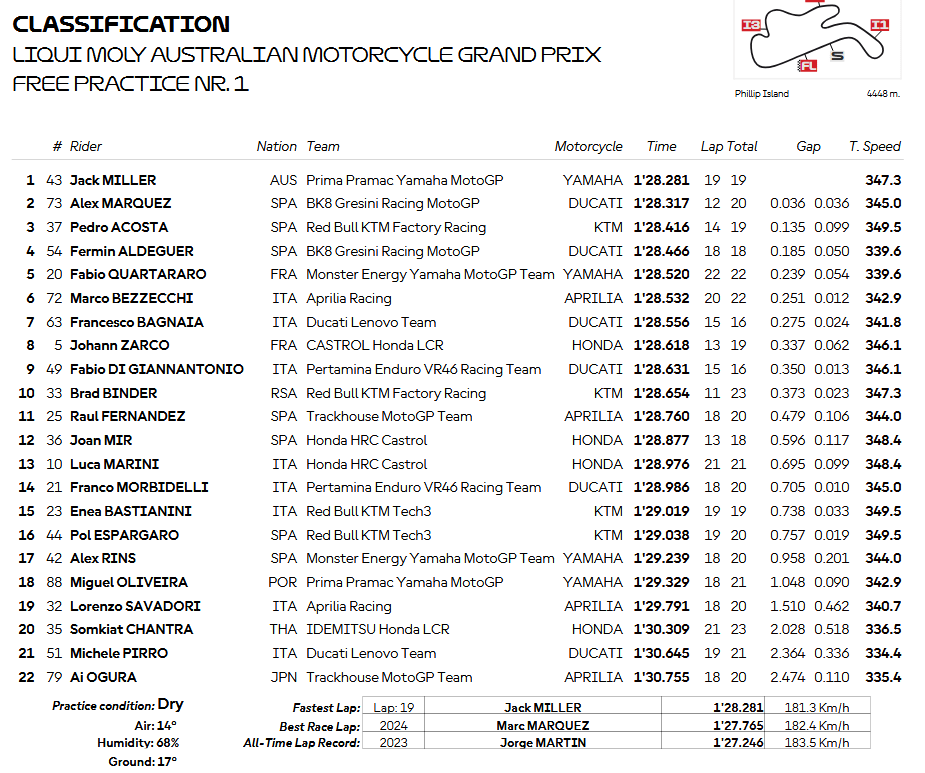 | 2025 Australian MotoGP, Phillip Island – Resultados PR | ||||||
