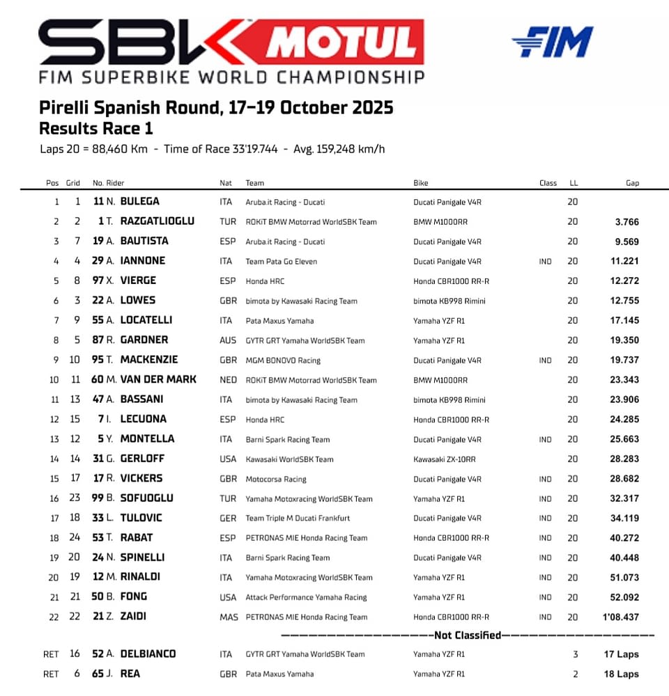 Razgatlioglu teve inicialmente um bom arranque e assumiu a liderança na Curva 1, mas Bulega respondeu no setor inicial e conquistou a liderança, enquanto Razgatlioglu caiu na classificação, acabando por recuperar para o segundo lugar na Curva 6, após ultrapassar Andrea Iannone (Team Pata GoEleven). O problema de Razgatlioglu era que Bulega já tinha dois segundos de vantagem sobre «El Turco» nesta altura. «Bulegas» estava numa liga à parte nas primeiras fases da Corrida 1, com voltas nos 1’38, enquanto Razgatlioglu estava nos 1’39, com o #11 a cruzar a meta em vitória, garantindo que a luta pelo título se prolongaria até ao último dia da temporada. Bulega conquistou a 18.ª vitória da sua carreira no WorldSBK, enquanto Razgatlioglu conquistou o seu 25.º pódio consecutivo: igualando o recorde histórico de Colin Edwards. Em termos de título, Razgatlioglu precisa de marcar apenas três pontos nas corridas de domingo para garantir o título.